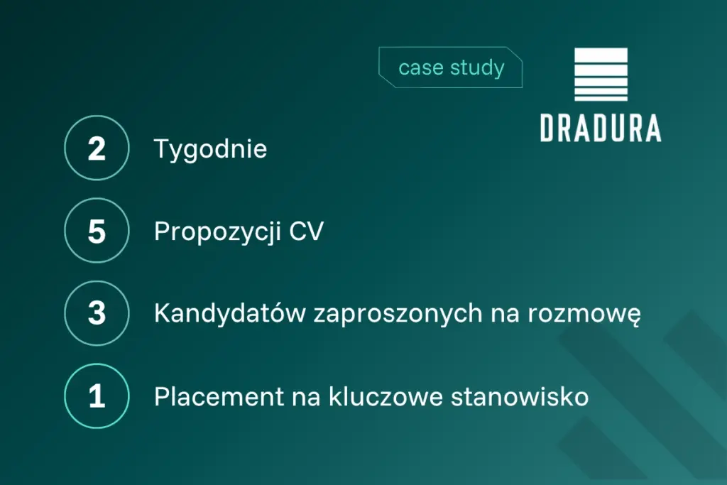 - Sprawna komunikacja i doradztwo – w ciągłym kontakcie z Dradura, wspieraliśmy firmę na każdym etapie rekrutacji, pomagając w podejmowaniu decyzji.